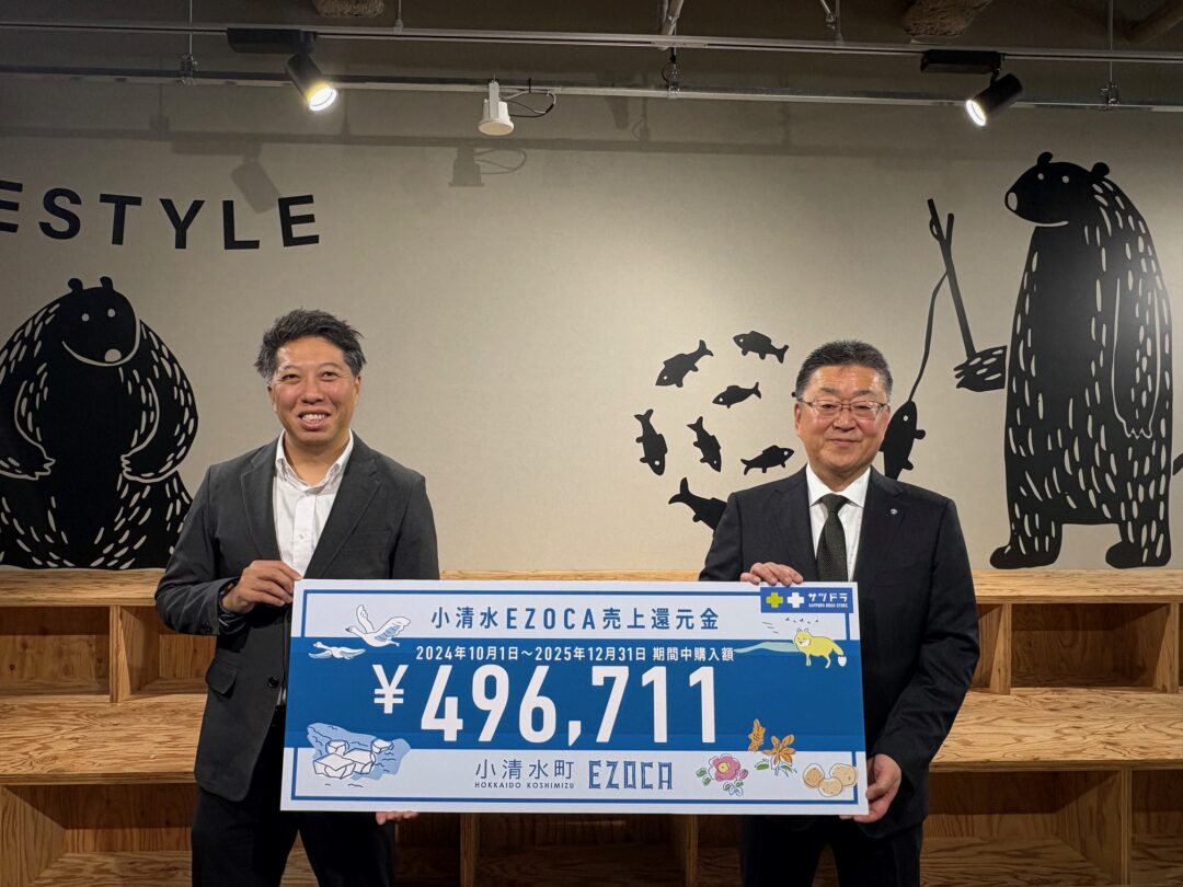 サツドラホールディングス株式会社のグループ会社である株式会社サッポロドラッグストアー(本社:札幌市東区、代表取締役社長 CEO:富山 浩樹、以下「サツドラHD」)は、北海道小清水町(町長:久保 弘志)と連携し推進している株式会社リージョナルマーケティング(本社:札幌市東区、代表取締役社長 COO:渡部 真也)の発行する小清水EZOCAを活用した取り組みにおいて、2回目となる還元金贈呈式を1月21日(水)に実施したことをお知らせいたします。